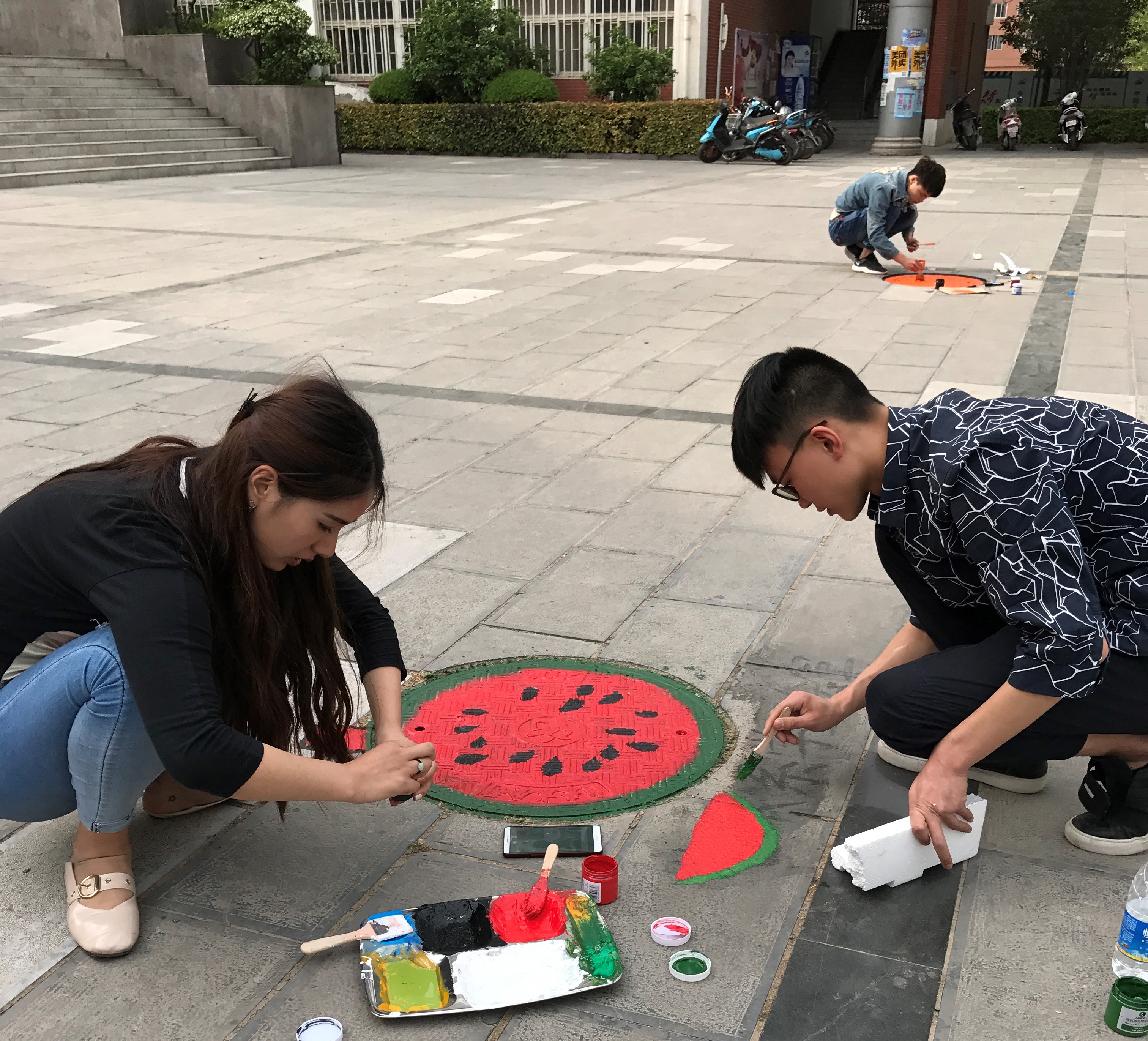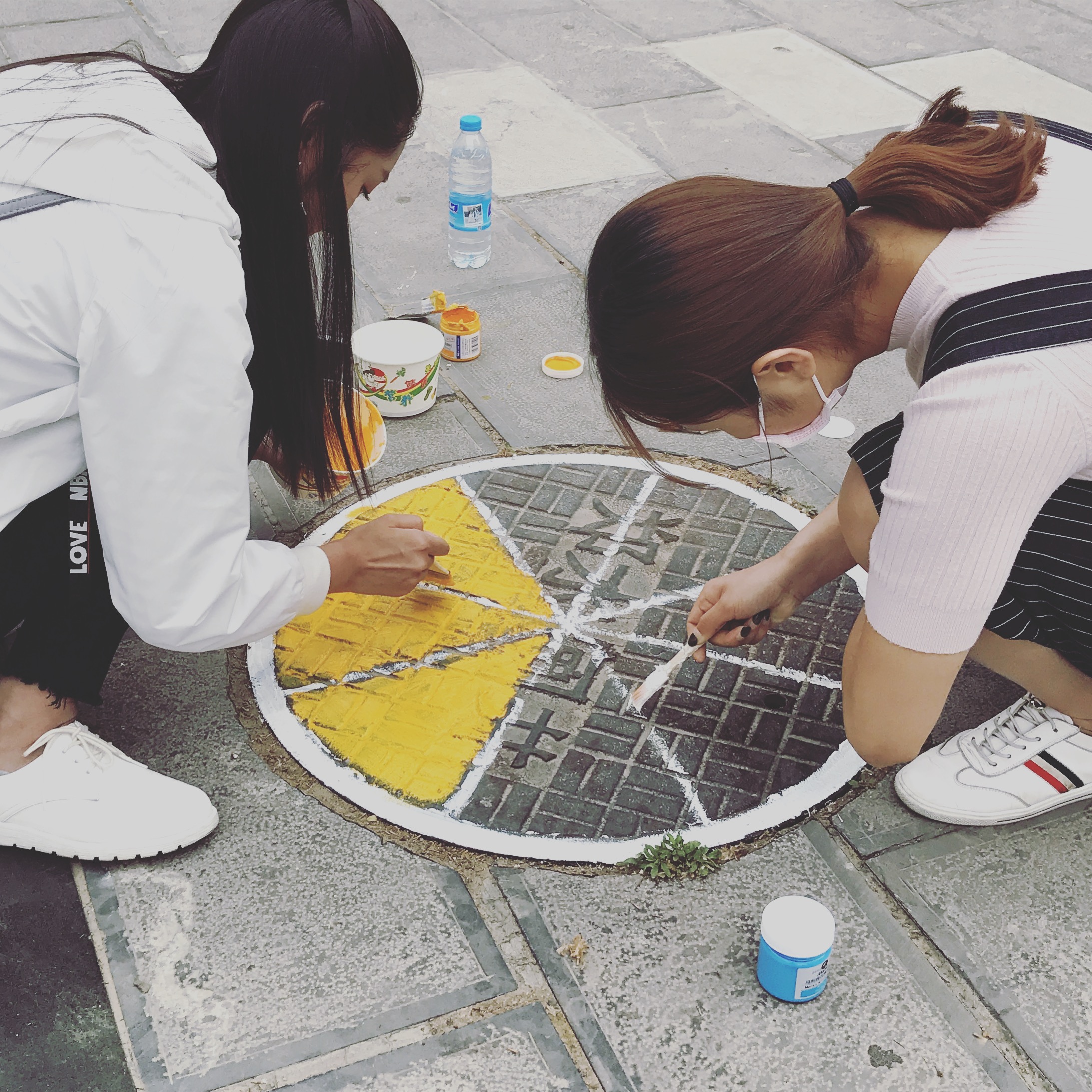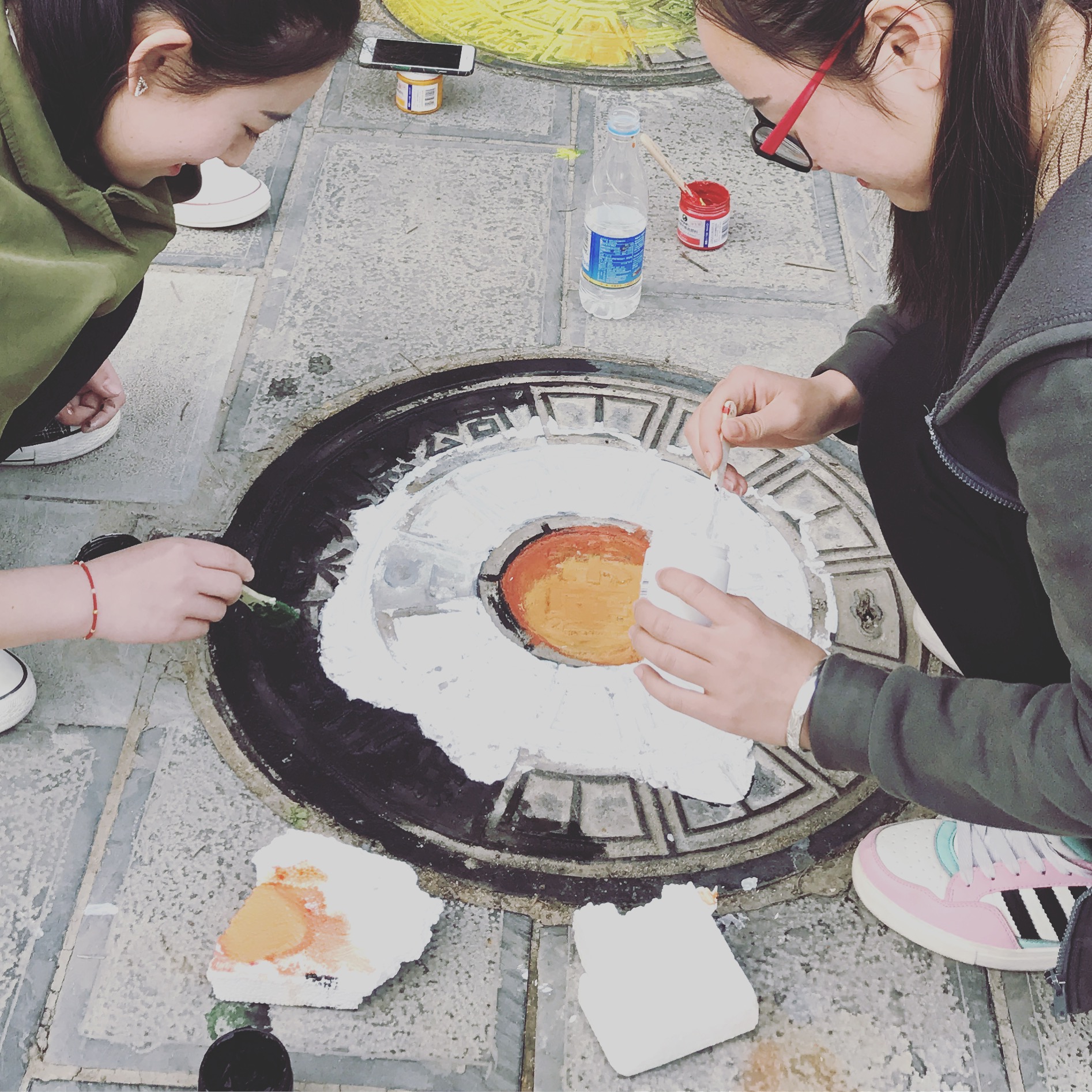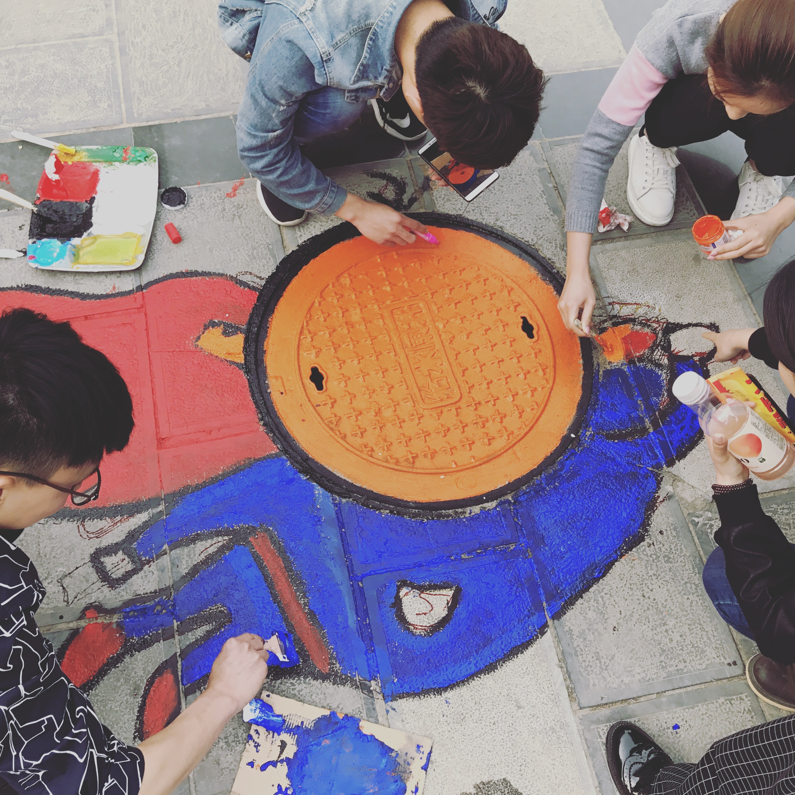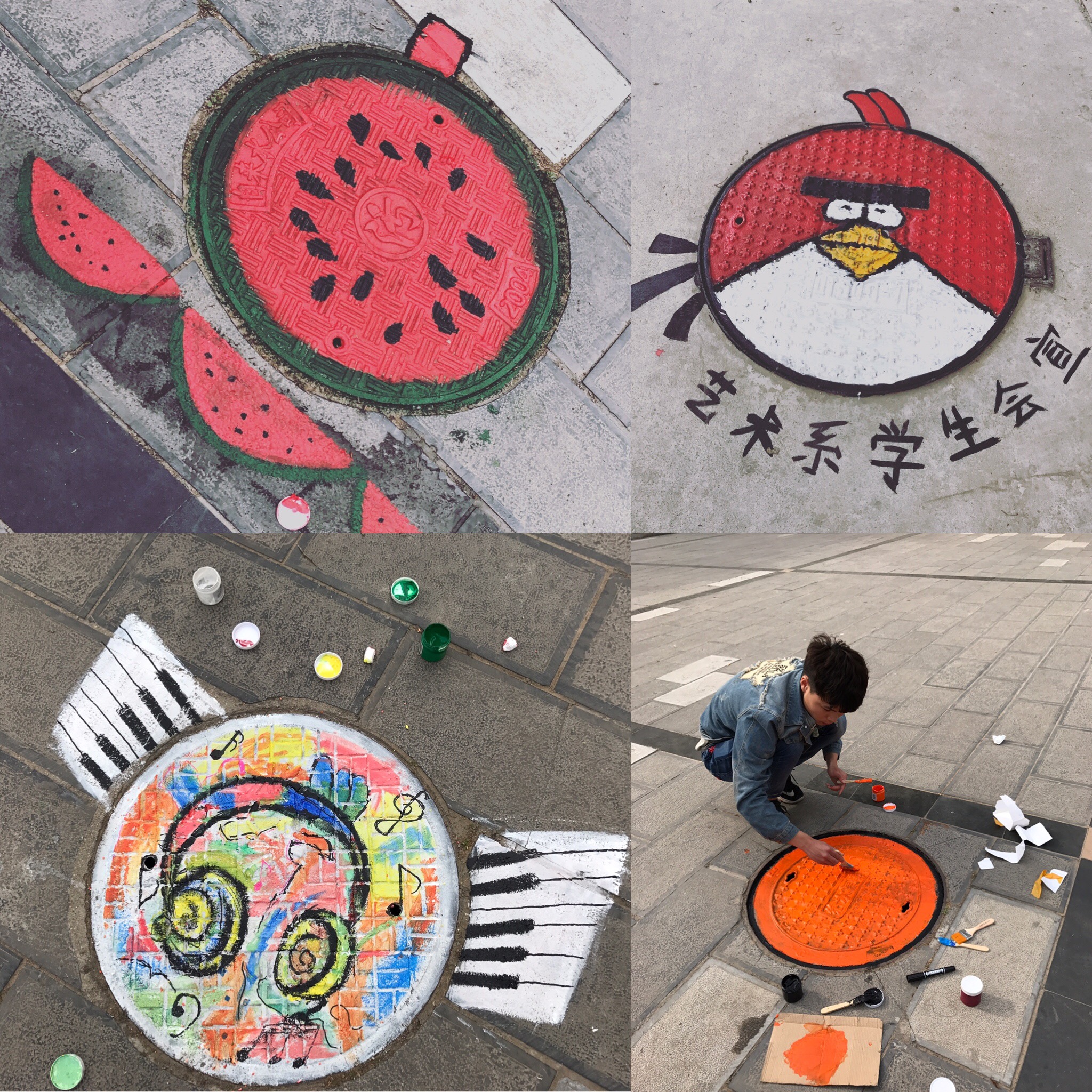 4月26日,艺术系同学在学生干部的带领下,对校园内的井盖进行创意涂鸦。两人成组,搜集最新、最青春、最具创意的图案设计,一点一点将同学们的青春和热情用画笔寄托在小小的井盖上。“黄澄澄的橙子”、“可口的西瓜”、“可爱的海绵宝宝”、“拉风的超人”、“跳动的音符”……一个个不起眼的井盖,在大家的共同努力下也显得那么有生气。每位同学从中午忙碌到晚上,围绕着小小的井盖,挥动着手里的画笔,只为了春天里校园中那一抹舒心的风景。