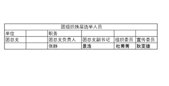 经选举,张静当选团总支负责人;景浩当选团总支副书记。杜菁菁任组织委员,耿雯捷任宣传委员。