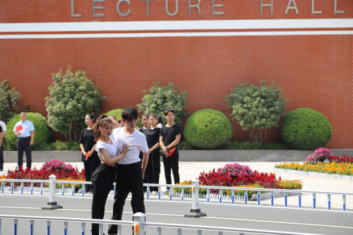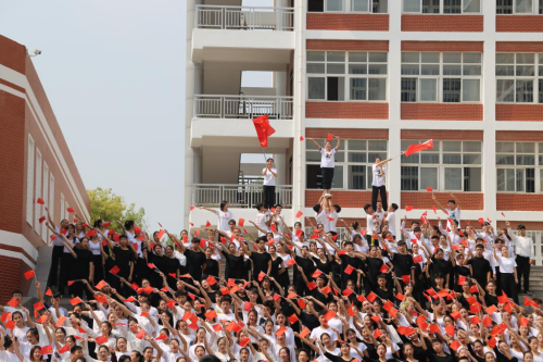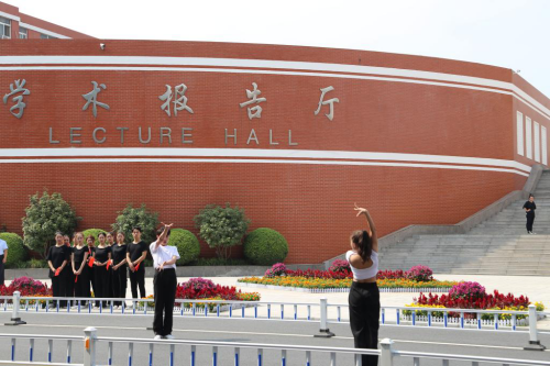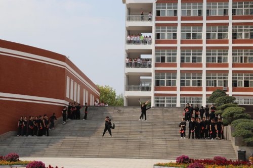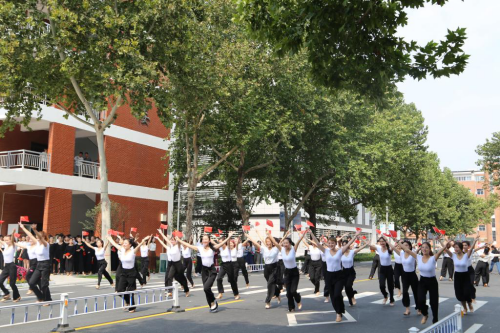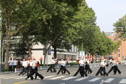 随着音乐的前奏,3对体育舞蹈学生舞出为成立新中国拼搏的灵魂,坚定有力且不悔的眼神吸引着行人的目光,前奏中《黄河》的旋律振奋了全场,将大家汇聚在学术报告厅广场前。接着又一队学生拿着五星红旗,在《我和我的祖国》旋律下,展示着艺术系体育舞蹈专业的基本功。一转眼,12对摩登舞者映入我们眼帘,她们旋转、优雅、延展、造型,每一帧都古典的像中世纪的画作。沿着她们的路径,自由、流畅的现代舞展示着祖国团结发展的画面。接着,自信有张力的牛仔舞更是舞出祖国崛起之后磅礴进步的势头。在音乐的高潮旋律中,学院领导带领着艺术系全体师生,唱着《我和我的祖国》,挥舞着手中的国旗涌向阶梯广场,我系技巧啦啦操学生更是高位托举挥舞国旗,音乐结束刹那,所有在场人员奋力喊出“祖国万岁”!