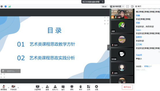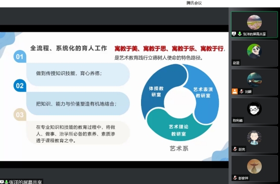 2022年05月10日19:00--20:30,马克思主义学院副院长刘颖博士和张洋老师以腾讯会议直播的形式开展“艺术教学中的课程思政运用”专题指导讲座。此次讲座由艺术系系主任孙爱景主持,我校教师40余人在线参加活动。