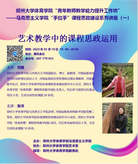 为贯彻落实《高等学校课程思政建设指导纲要》,把思想政治教育贯穿于人才培养体系和全面推进高校课程思政建设,实现课程思政与思政课程的深度融合,努力发挥好每门课程的育人作用,结合《郑州大学体育学院“课堂教学质量提升年专项行动”工作方案》要求及防疫工作要求,马克思主义学院教师分赴学校8个系部开展马克思主义学院“手拉手”课程思政建设系列讲座等课程思政建设指导工作。