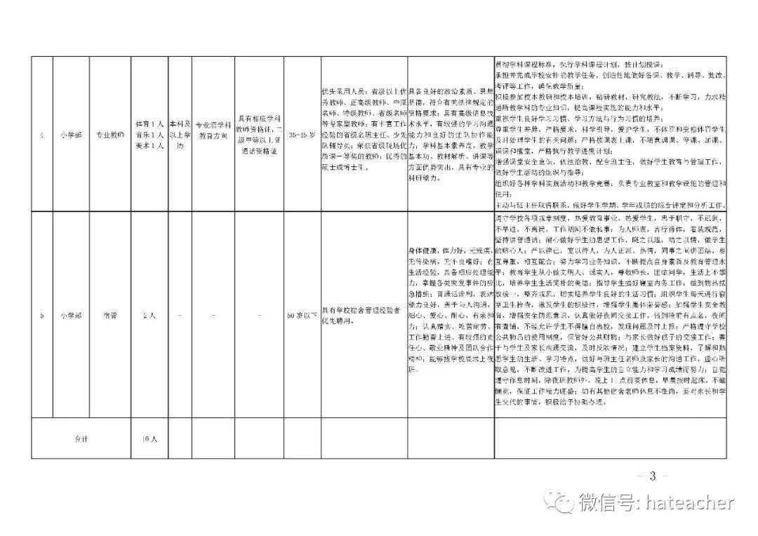 本次招聘小学教职工共计10名。具体岗位职责和任职要求,详见附件1《郑州市金水区经纬学校小学部招聘岗位素质条件和岗位职责》。