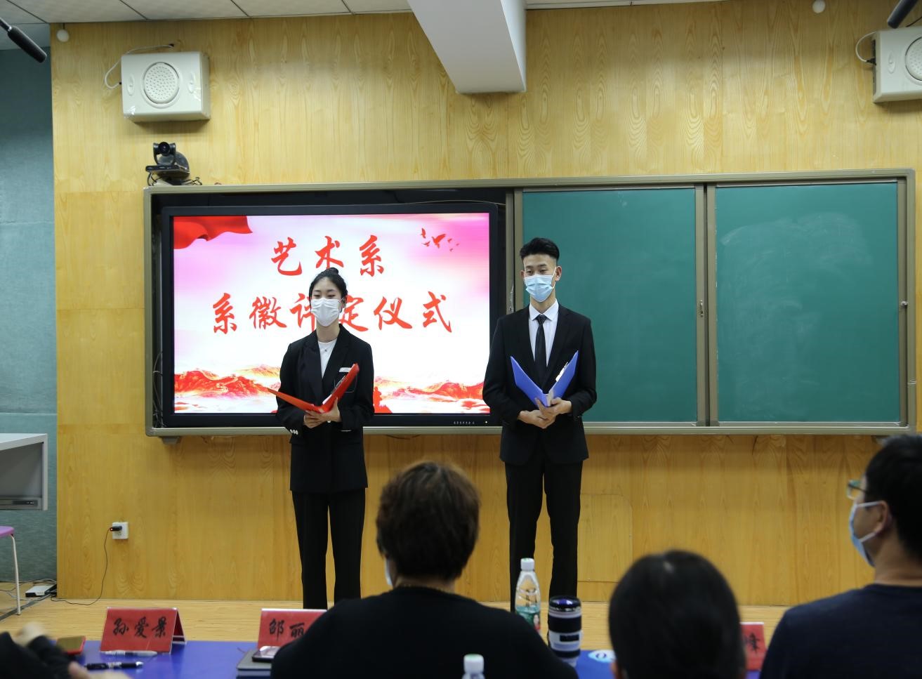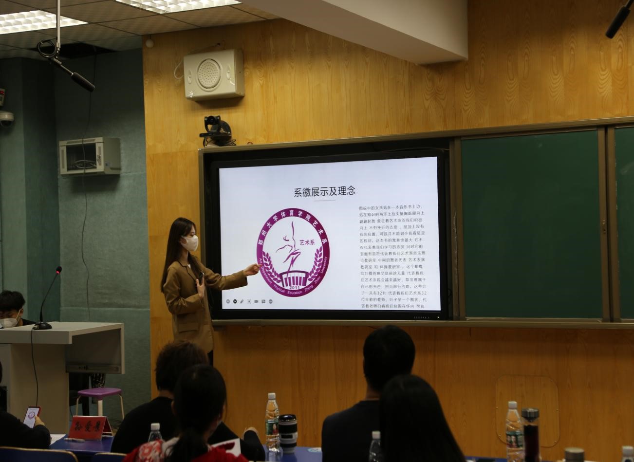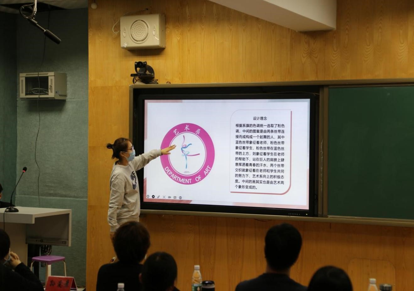 仪式上,11位入围的参赛选手富有激情地分享各自作品的设计要素、设计理念。2019级体舞3班的程莉珊把一男一女翩翩起舞放在系徽中间,象征着具有观赏性的体育舞蹈;2019级体舞4班的李亚茹、张子洋把斗牛舞中最经典的裙摆飞扬、气宇轩昂的舞者造型应用在系徽当中,象征着艺术系勇往直前的大无畏精神;2020级体舞1班邢潇方的系徽图案以音符和舞者构成,象征着艺术理论教研室和艺术表演教研室及体操教研室;2020级体舞3班的花都的系徽图案以三个舞动的人偶手拉手构成,象征着艺术系的同学们团结和友爱……