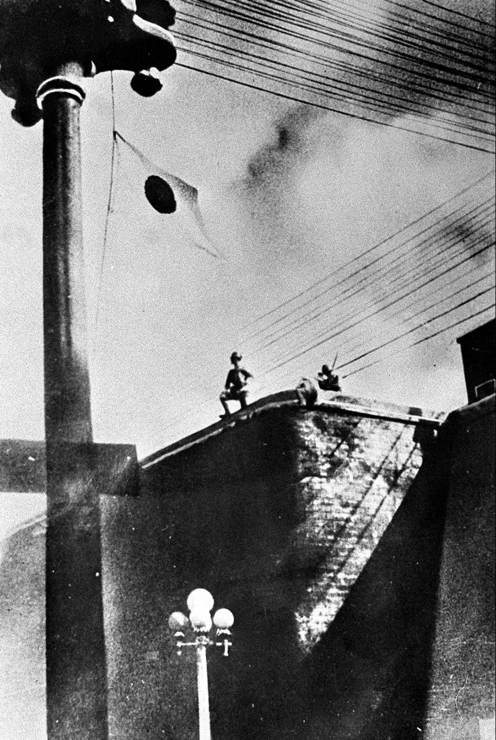日军侵占沈阳城后,耀武扬威地站在城头,悬挂起日本国旗