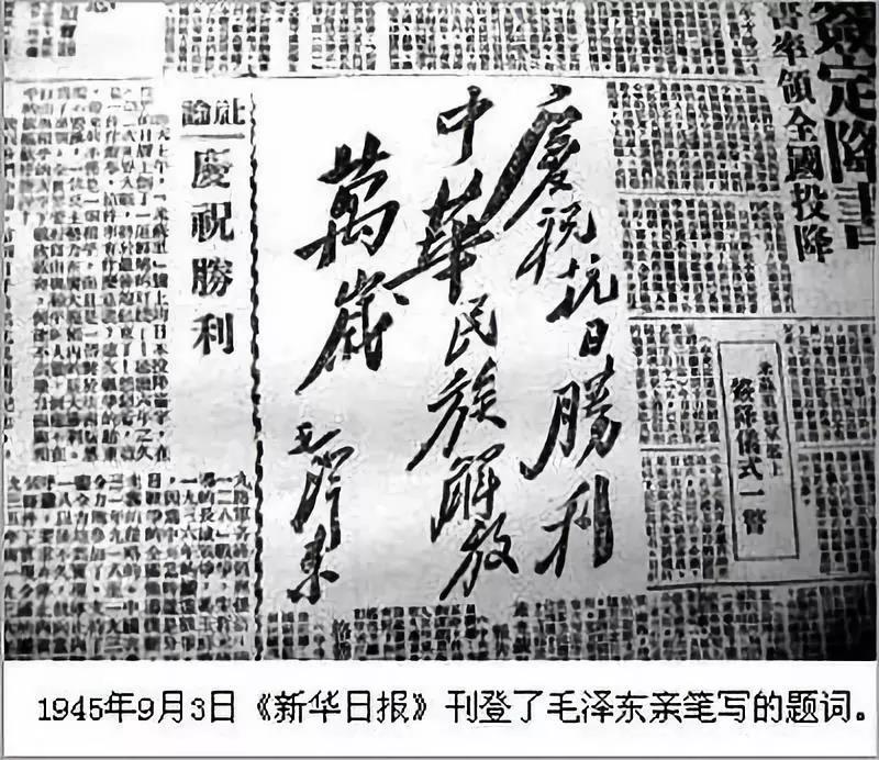 毛泽东题写的庆祝抗战胜利题词,刊登在1945年9月3日出版的《新华日报》第二版。