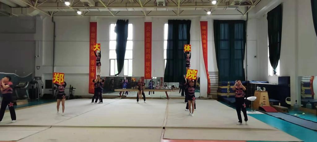 首先是技巧啦啦操自选动作,队员们一上场手中高举的“ZDTY”、“郑大体院”格外的引人注目。一系列高难度的托举及空翻忍不住令人叹为观止,时而严整时而灵动的队列诠释出属于他们的活力与激情。