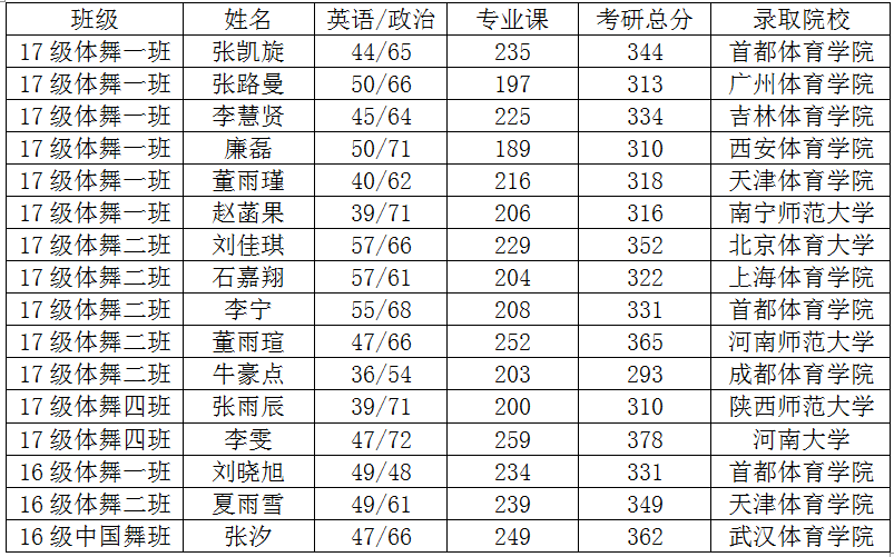 宝剑锋从磨砺出,梅花香自苦寒来。艺术系考研捷报频传,据统计,我系2021届毕业生中31人报考全国硕士研究生入学考试,19人上线,上线率为61%,录取13人,录取率为42%,考研上线人数比例、录取人数比例均创历史新高。今年我系考研学生分别被上海体育学院,北京体育大学,首都体育学院,陕西师范大学等211,双一流高校录取。