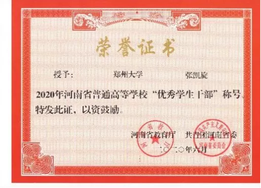 他连续三年以年级第一的成绩获得国家奖学金、国家励志奖学金、学院奖学金等;曾获2020年度河南省优秀班干部荣誉称号,且带领班级荣获河南省优秀班集体荣誉称号;连续三年获得郑州大学体育学院三好学生、文明学生、十佳好青年等荣誉称号;除此之外,他代表学院参加第三届全国体育院系大学生体育艺术节并荣获体育舞蹈类节目金奖;担任中华人民共和国第十一届少数民族传统体育运动会志愿者;在毕业之际,以优异成绩考入首都体育学院研究生学院。
