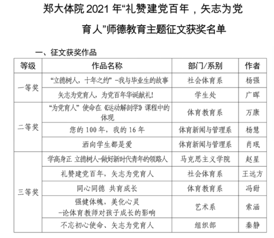 为庆祝建党一百周年,我系组织教师积极参与学院“礼赞建党百年,矢志为党育人”师德教育主题征文活动。经过踊跃投稿和初选,我系选送的征文《强健体魄 美化心灵——论体育教师对孩子成长的影响》获三等奖。