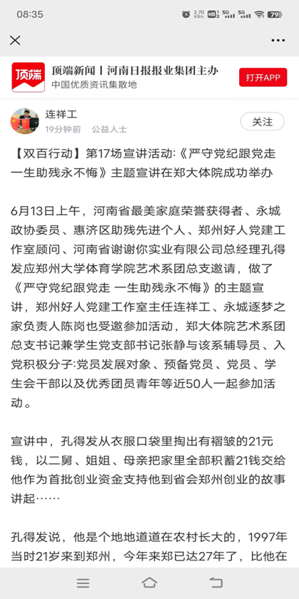 活动伊始,张静老师发表了热情洋溢的致辞。她强调,作为新时代的文艺工作者,我们要始终坚守党的纪律,与党同心同德,积极响应党的号召,用实际行动践行社会主义核心价值观。同时,它也呼吁同学们要发扬人道主义精神,关注残疾人群体,用自己的方式帮助他们融入社会,共享发展成果。紧接着宣讲中,孔得发从衣服口袋里掏出有褶皱的21元钱,以二舅、姐姐、母亲把家里全部积蓄21钱交给他作为首批创业资金支持他到省会郑州创业的故事讲起……以生动的故事和感人的事例,向在场的师生们讲述了他的故事,并在陈岗和连祥工的讲述下,让我系同学们更深的了解到残疾人群体的生活现状和需求,以及助残工作的重要性和紧迫性。