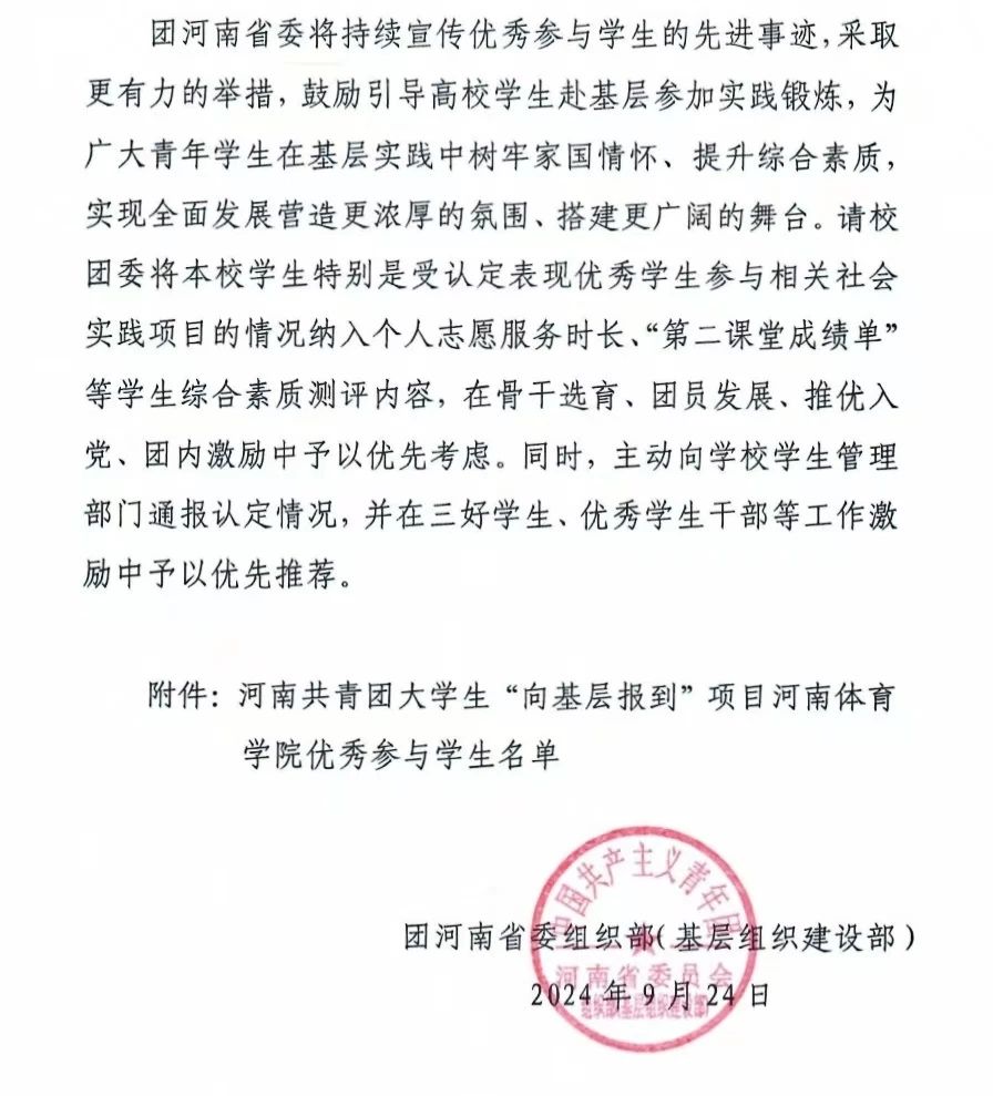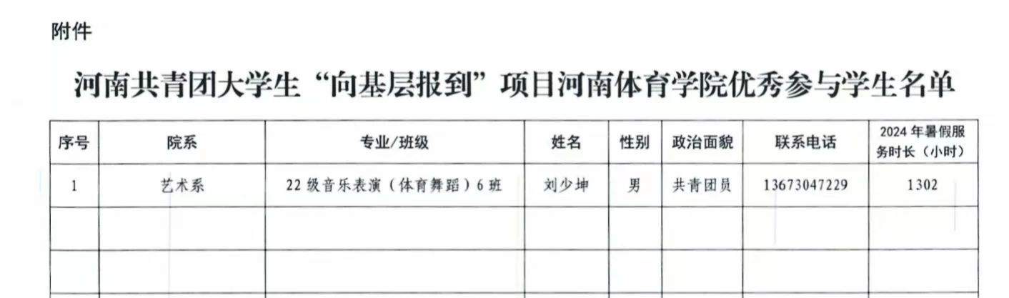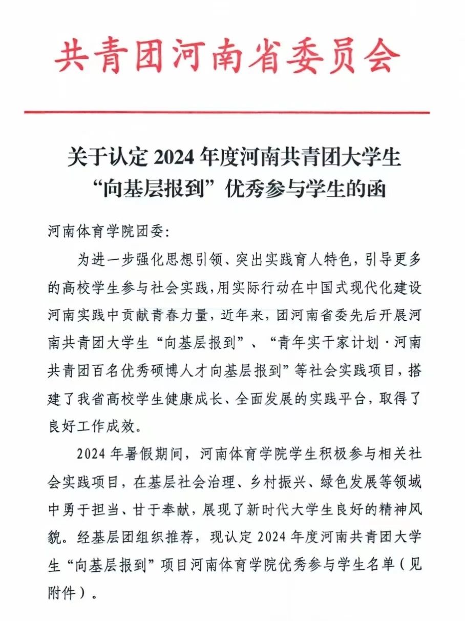近日,共青团河南省委员会印发《关于认定2024年度河南共青团大学生“向基层报到”优秀参与学生的函》,我系2022级体舞六班刘少坤同学作为全省共青团大学生“向基层报到”活动参与者之一荣获“河南共青团大学生向基层报到项目优秀参与学生”称号。