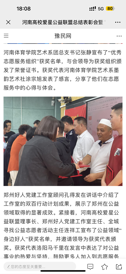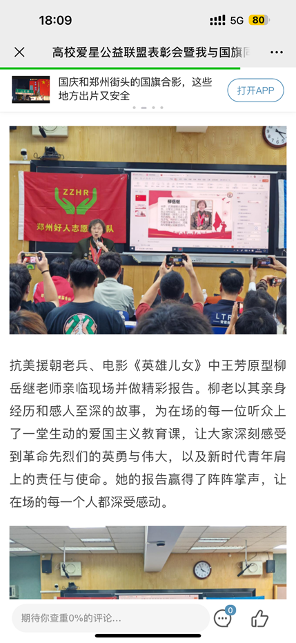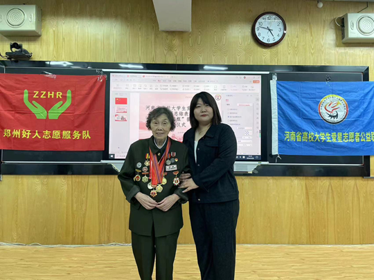 会议伊始,全体起立,奏唱《中华人民共和国国歌》,接着河南省高校大学生爱星志愿者公益联盟常务副理事长、顶端新闻文学频道郑州市活动负责人、“我与国旗同框”摄影大赛执行主任赵尹达发表了讲话,随后,我系团总支书记张静老师宣布高校“优秀志愿服务组织”获奖名单,请与会领导颁奖。此次活动也很荣幸邀请到抗美援朝志愿军老兵柳岳继奶奶进行讲话,她曾参加上甘岭战役,荣获三等功,也是电影《英雄儿女》王芳的原型,被称为“上甘岭上的百灵鸟”,柳岳继奶奶分享自己的参兵经历使我们肃然起敬,在场的各位都被奶奶所讲述的故事而感动,并且将“学无止境”这一劝告牢牢记在心中。