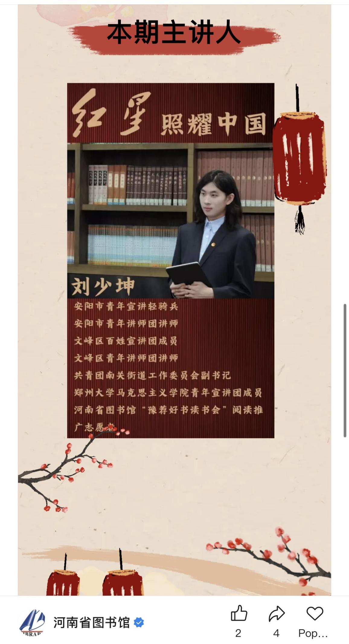 为助力书香安阳建设,推动全民阅读在青年中落地生根,让青年养成良好的阅读习惯,碎阅轩书社社长刘少坤联合文峰区新时代文明实践中心、文峰区文化馆、文峰区图书馆共同举办了“书香安阳,全民阅读”读书会、“春之青”诗词分享沙龙、“我们的节日·元宵”灯谜诗词分享会等活动。