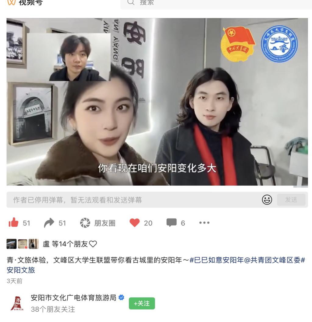 春节期间,为更好地服务市民群众、青春助力安阳文旅深度融合,大年初一到初六期间,刘少坤联合文峰区委组织部动员大学生联盟90余名青年志愿者在西大街历史文化街区开展志愿服务活动,并拍摄文旅宣传视频、拜年贺岁片为安阳市文化广电体育旅游局助力。