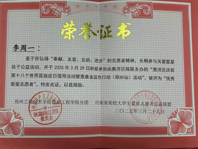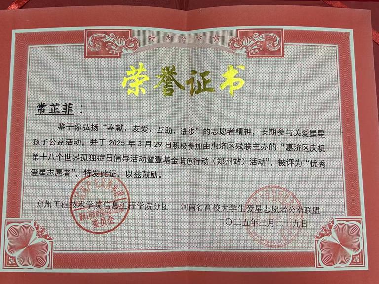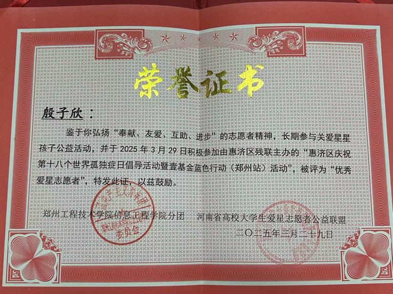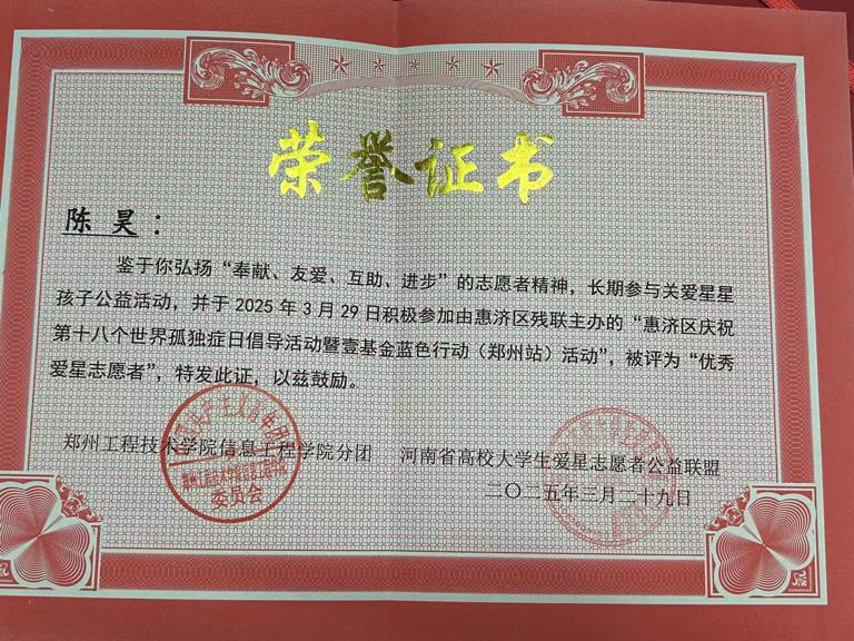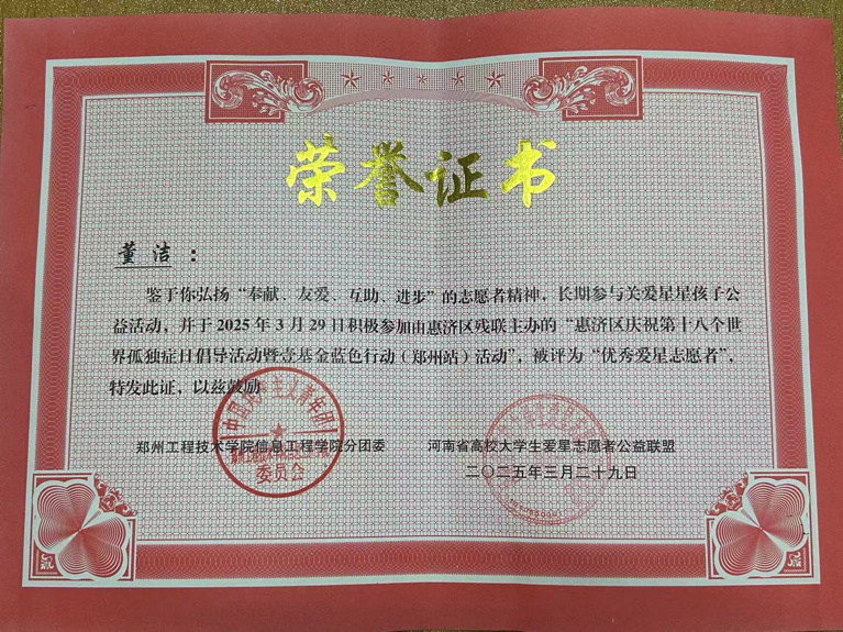 4月2日,第18个“世界孤独症日”来临之际,河南省高校大学生爱星志愿者公益联盟联合郑州工程技术学院信息工程学院分团委,对在孤独症公益事业中表现突出的85名“优秀爱星志愿者”及19个“优秀志愿服务组织”进行了表彰。本次活动在郑州工程技术学院信息工程学院报告厅举行,惠济区残疾人联合会等单位领导及嘉宾出席,并为获奖者颁发荣誉证书。