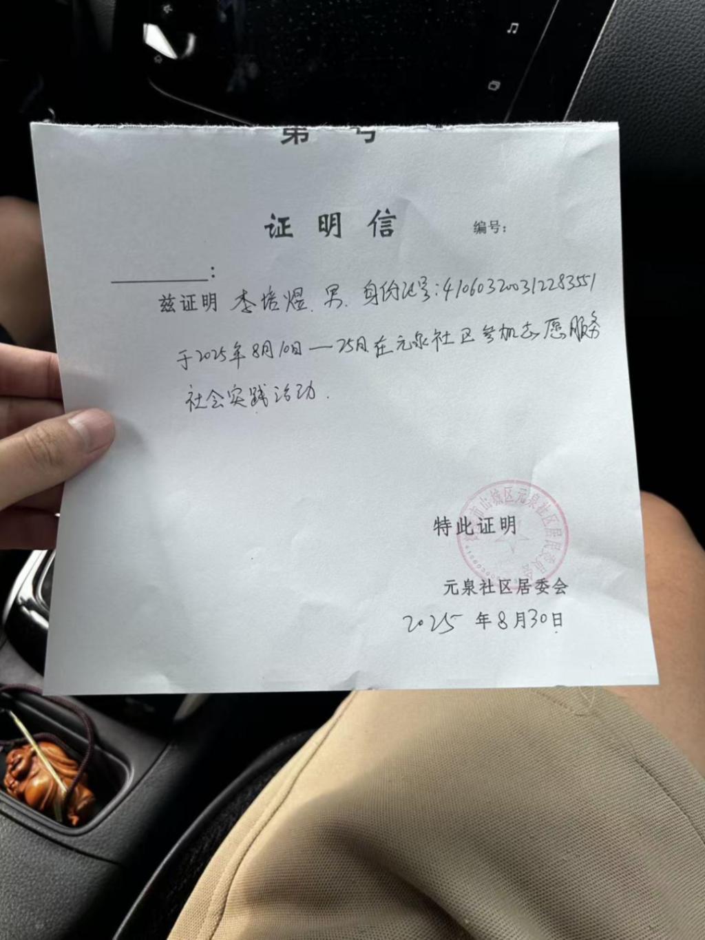 2025年8月10日至25日,“艺启爱”辅导员工作室学生代表李培煜,怀揣对家乡的赤诚与工作室“思政铸魂、以艺惠民”的理念,回到家乡河南省鹤壁市山城区元泉社区,开展为期15天的暑期社会实践活动,以实际行动践行青年担当,让思政力量在反哺家乡的实践中落地生根。