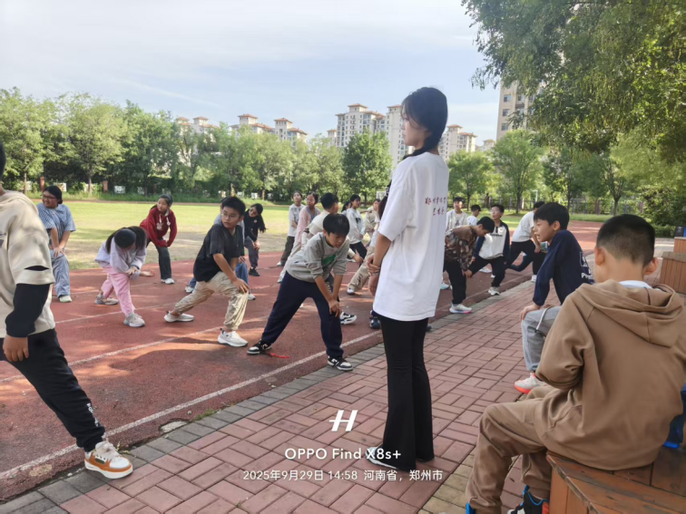 在新郑市国瑞小学的操场上,支教学生赵翊彤将艺术元素融入体育教学,原本单调的队列练习变成了“节奏踏步游戏”,孩子们跟着她设计的节拍变换队形,稚嫩的笑声在操场回荡;