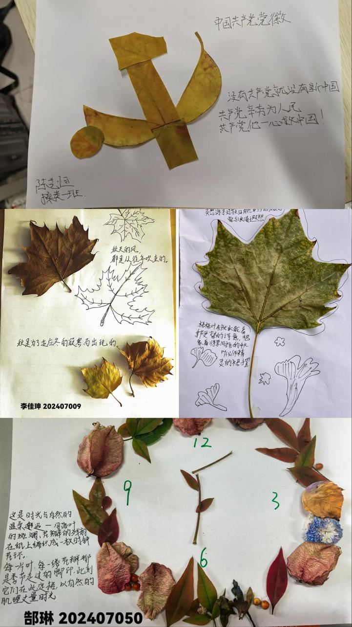 我系组织开展“秋叶拾趣,创意定格”主题户外实践活动,以秋叶与想象结合的创新形式,引导学生在创作中感受自然之美、释放心灵压力。活动伊始,大家走出教室捡拾秋叶,发挥创意将叶片剪裁、拼贴,制成风景、动物、人物等各式作品,把自然之美与心中所想融为一体。活动不仅丰富课余生活,更让学生在创作中舒缓压力,感受艺术与自然的双重治愈。