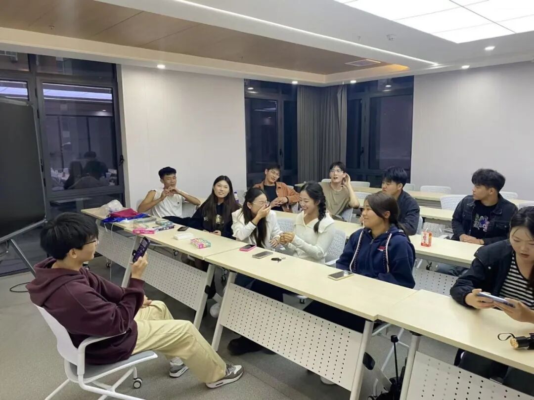 随后,同学们有序分发零食与饮料,大家围坐成圈,边品尝美食边畅谈日常,欢声笑语不断,让活动现场满是家的温馨。游戏环节中,“默契大考验”“组队猜歌名”等趣味项目轮番登场,师生共同参与、默契配合,现场欢呼声与喝彩声此起彼伏,气氛持续升温。