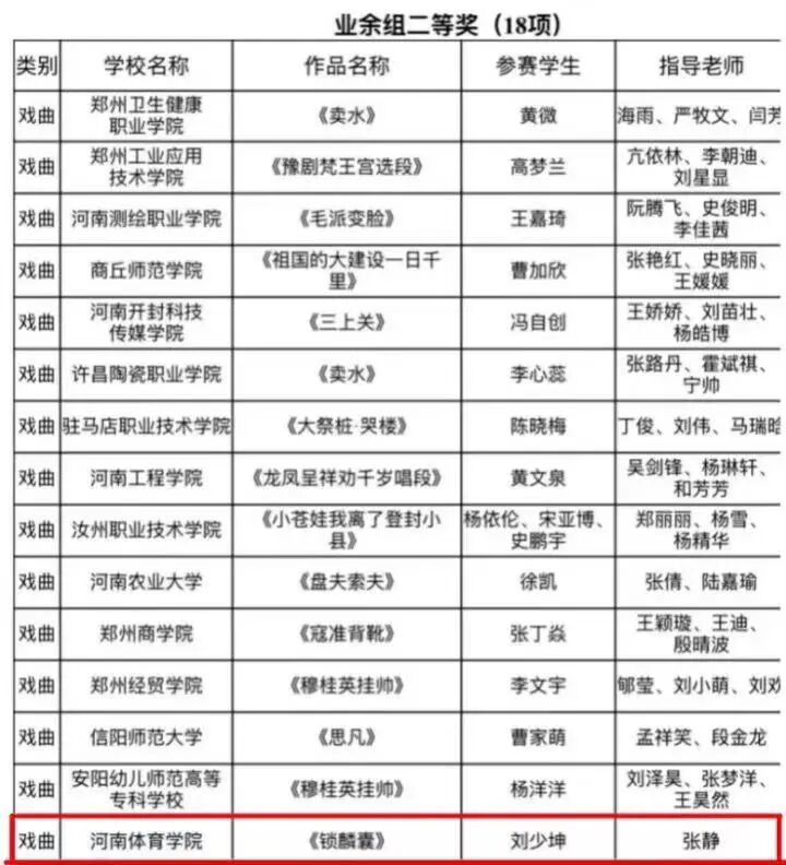 在戏剧(戏曲)类比赛中,我系学子刘少坤带来的戏曲作品《锁麟囊》荣获二等奖。指导老师张静对作品进行全方位指导,学子以扎实的戏曲功底,将传统戏曲的韵味与内涵精准呈现。这一成绩既是对学子专业能力的肯定,也是我系履行传统戏曲校园传承义务、推动非遗文化普及的生动实践。