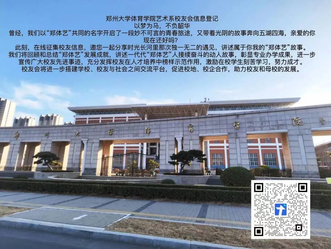 希望广大校友和所有关爱郑州大学体育学院艺术系的人士为校友会的建设献计献策,期待您的宝贵建议。校友会信息将期待您的登记,不管您身在何方,您都是母校放飞的风筝,永远的牵挂。请带上艺术系对您的问候和祝福,常“回家”看看。